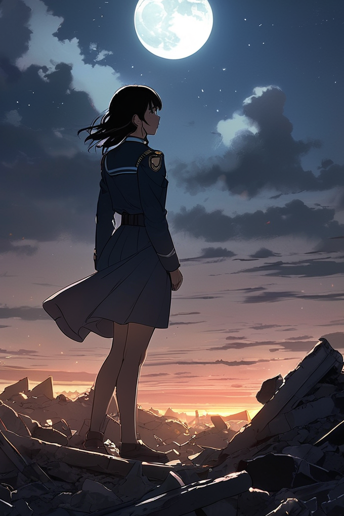 在深夜的城市废墟中,他躺在断垣残壁中,看到废墟的山顶上,有一个女人背对着月光,向他伸出了手。