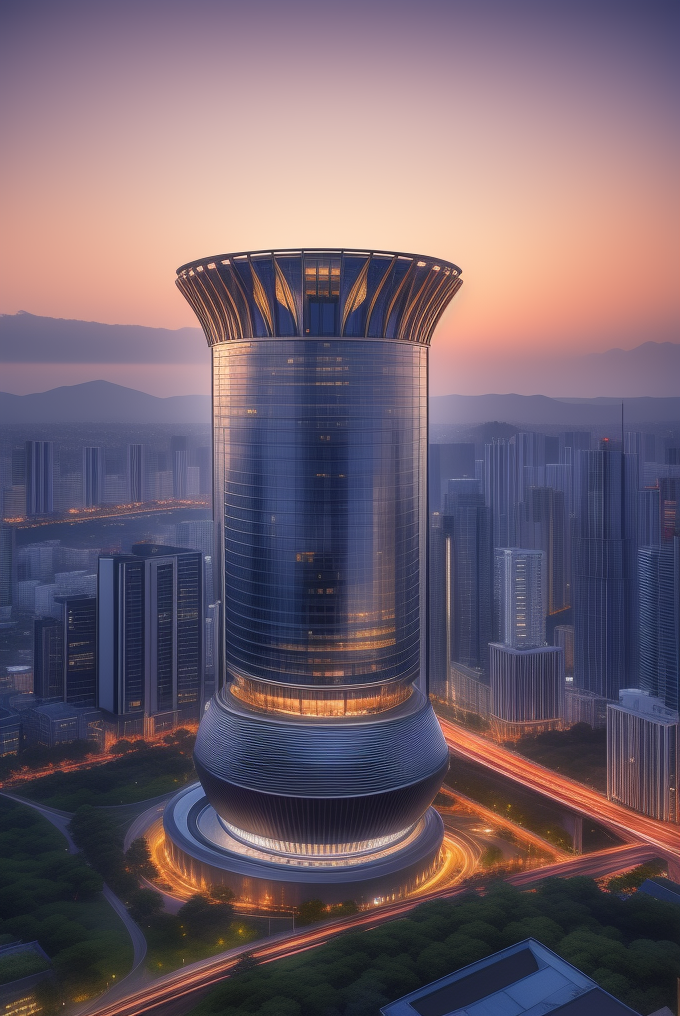 整个酒店是一个圆环形的建筑,造型类似于一个圆柱体。圆柱体的中心圆柱被挖空了,形成了一个类似环形的建筑风格。