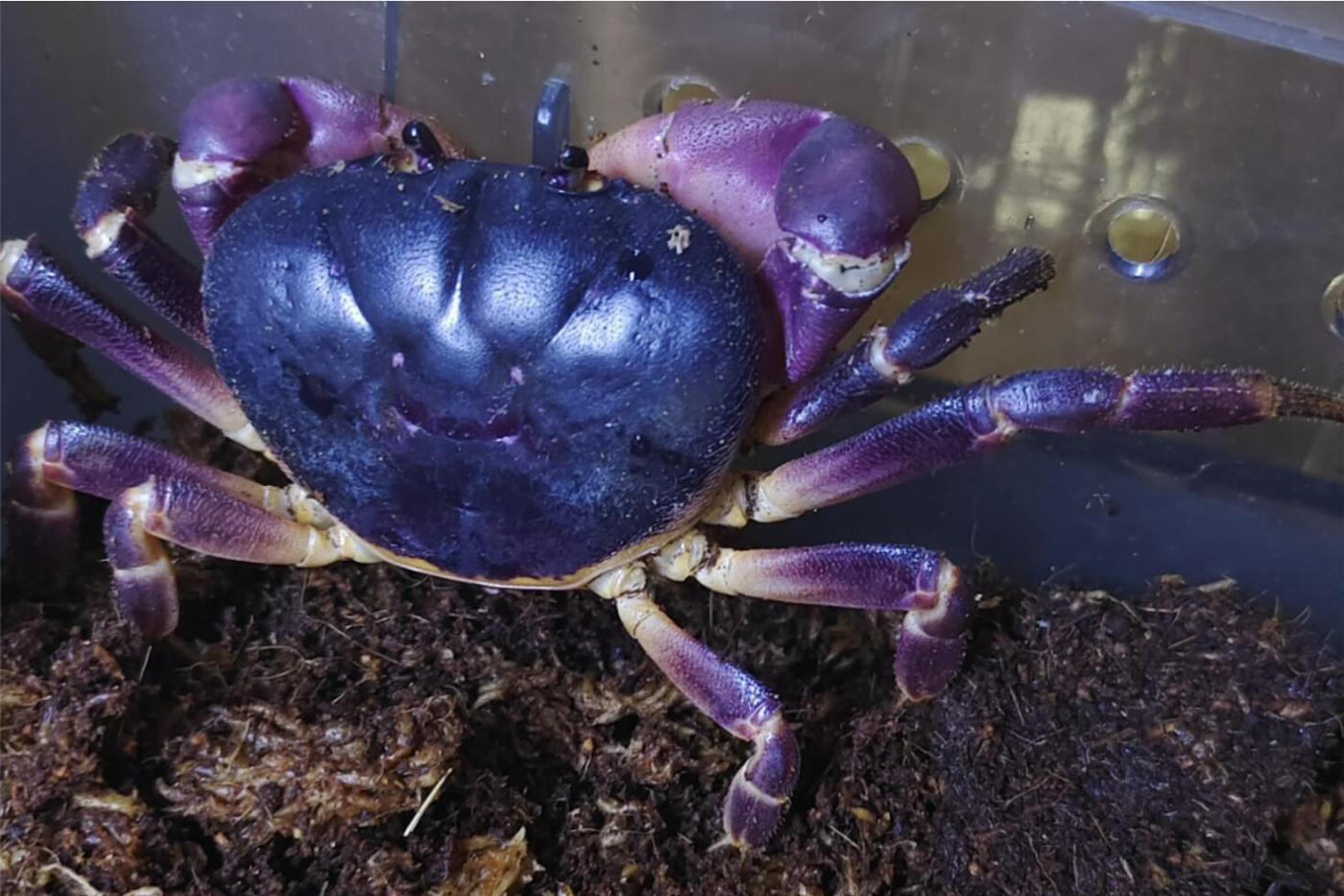 他让两人站着别动,自己前迈两步把螃蟹按住,拿到手上细看,只见其背壳为深紫色,这个紫色一直延伸到十足,且越往爪尖颜色越淡。