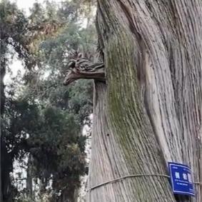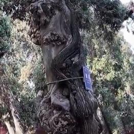 【它的树皮层层叠叠的,蜿蜒着绕了这棵柏树的树身一周,看起来就像是一条银蛇紧紧的缠绕在树身上,所以这棵树被叫做银蛇缠柏。】