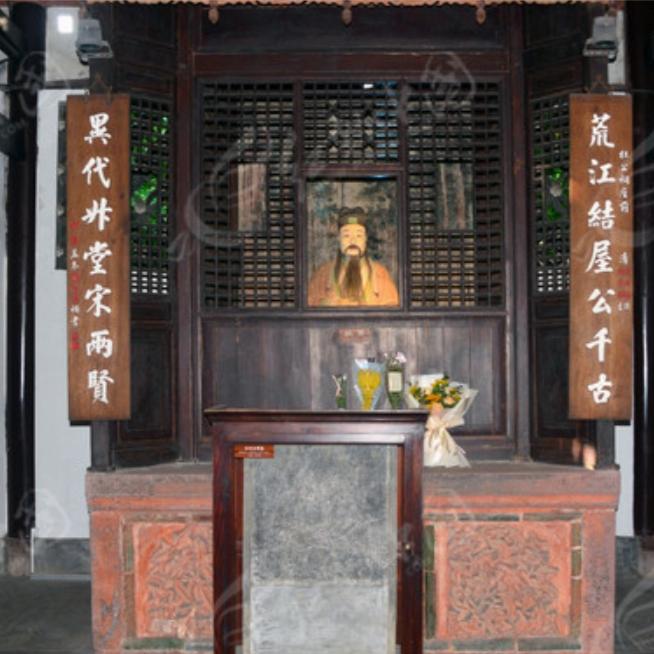 【在工部祠高高的房梁上,同样刻着八个大字:“骚坛鼎峙,诗令长留”。】